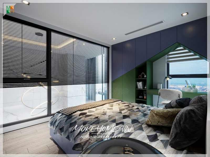 Mẫu thiết kế phòng ngủ con với nội thất gỗ công nghiệp được phối màu theo kiểu độc đáo.