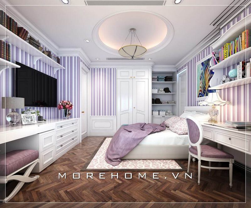 Gia chủ trong không gian phòng ngủ chung cư cao cấp đã lựa chọn tone màu trắng chủ đạo, kết hợp với màu tím mộng mơ và sàn gỗ nâu trầm tạo nên sự sang trọng và độc đáo cùng với những tiện nghi hiện đại.